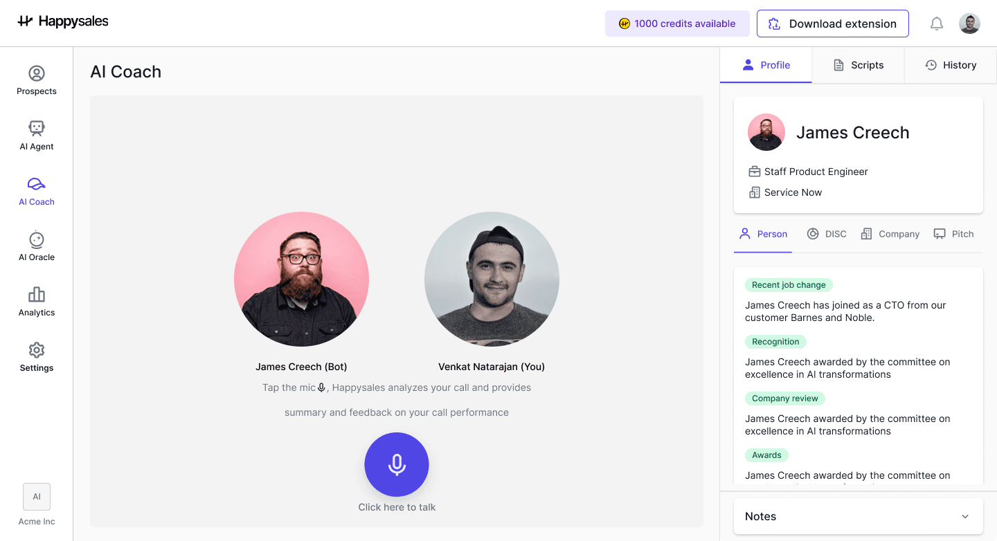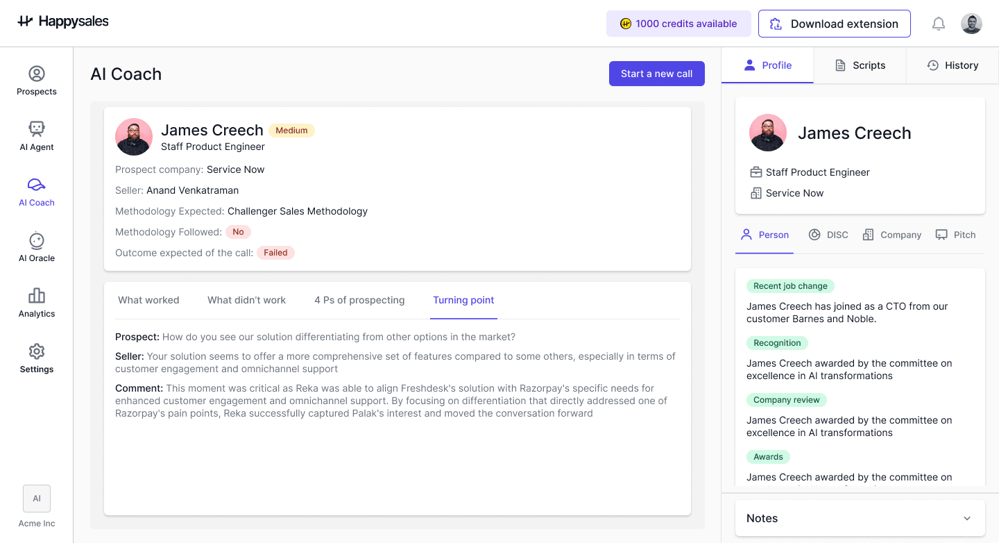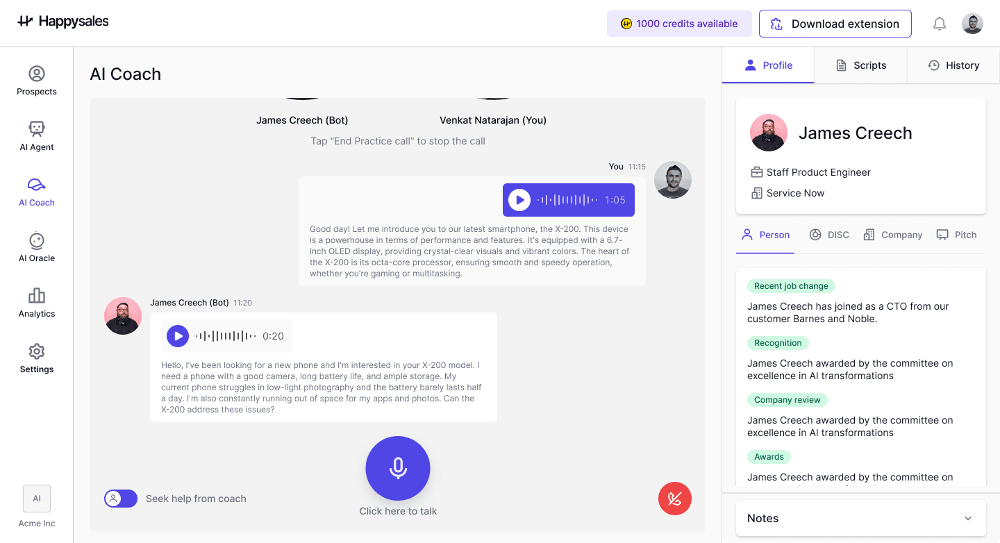 This feature allows sales reps to repeatedly practice and refine their approach, ensuring they are well-prepared for real interactions with prospects.