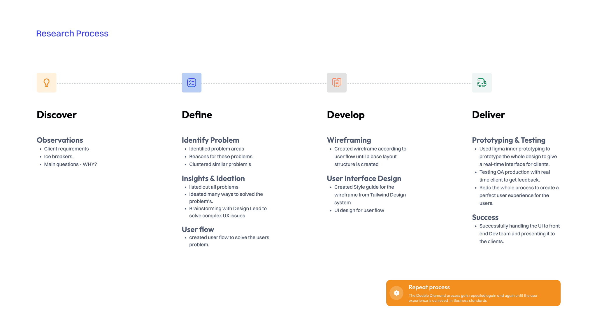 My research process was a journey of continuous exploration and refinement, guided by the principles of the double diamond framework. I dove deep into understanding the needs and pain points of sales professionals, iterating through cycles of diverging and converging on insights.